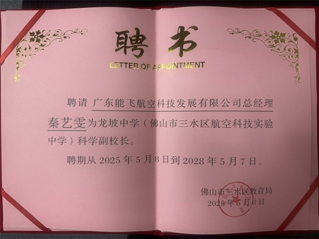 在此次大会上,能飞航空副总经理秦艺雯凭借卓越的专业素养和丰富的实践经验,被正式聘任为佛山市三水区航空科技实验中学科学副校长,开启助力该校低空科技教育事业腾飞的新征程。
