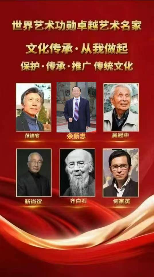 启功、李可染、欧阳中石、黄永玉、沈鹏被评为“艺术百年·新中国十大巅峰艺术家”。 同年 11 月 ,余新志被联合国教科文组织授予“联合国文艺宣传大使” ,并颁发了“大国荣誉金杯奖”2025 年 ,余新志又被联合国教科文组织聘为名誉主席 ,并颁发了聘书。