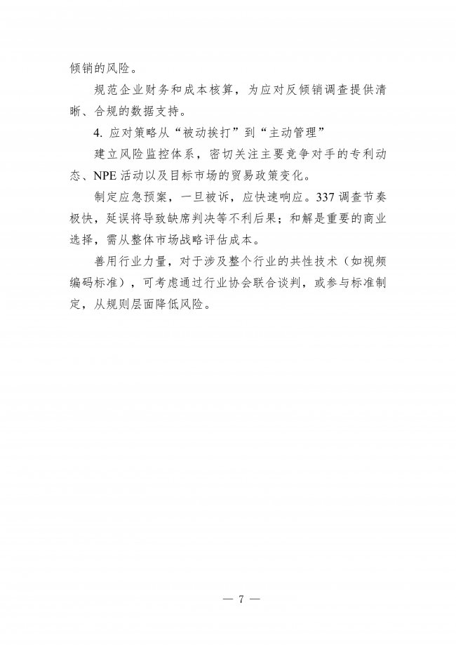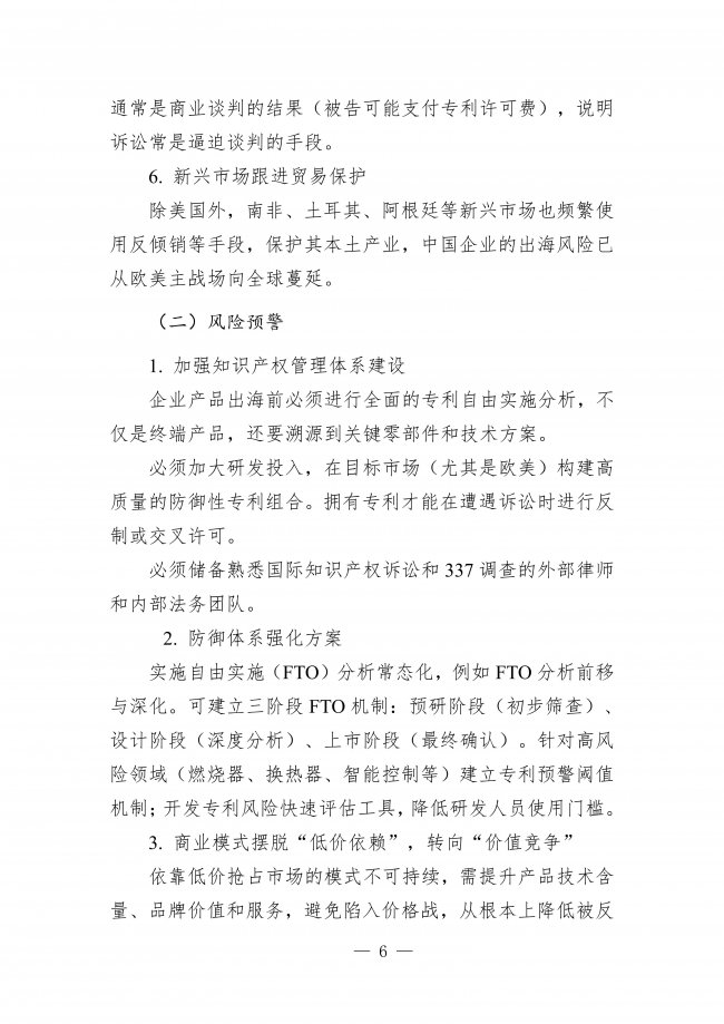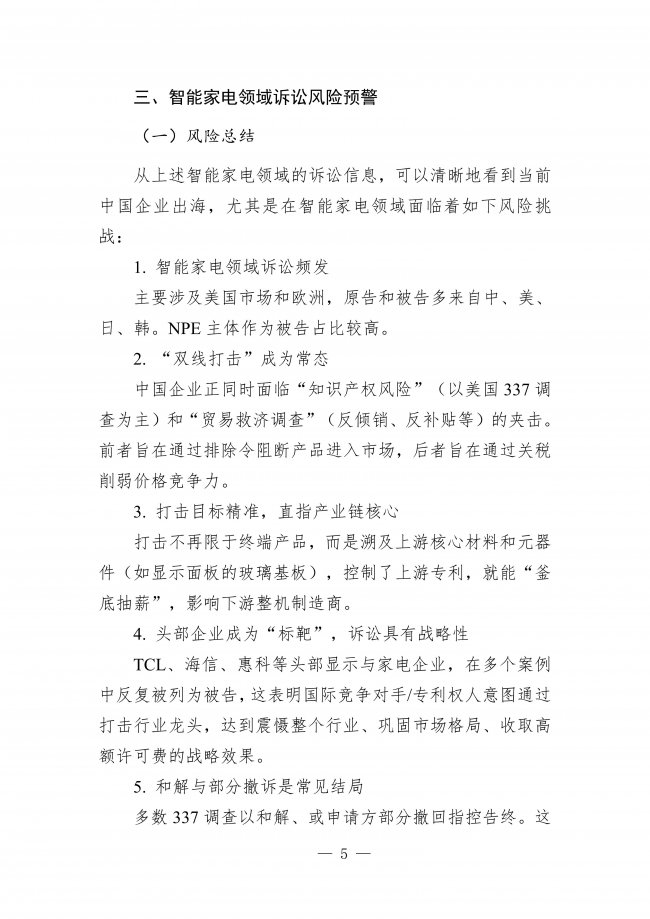 2025年相关诉讼及贸易救济案件显示,智能家电出海面临多重风险:诉讼频发于美国和欧洲市场,中、美、日、韩企业为主要参与方,NPE主体占比高;中国企业同时面临“知识产权风险”(以美国337调查为主)和“贸易救济调查”(反倾销等)的“双线打击”;打击目标精准指向产业链核心,从终端产品溯及上游核心材料和元器件;TCL、海信、惠科等头部企业成为“标靶”,诉讼具有战略性;和解与部分撤诉是常见结局;新兴市场也频繁使用贸易保护手段。对此,企业需加强知识产权管理体系建设,强化防御体系,摆脱“低价依赖”转向“价值竞争”,并将应对策略从“被动挨打”转为“主动管理”。